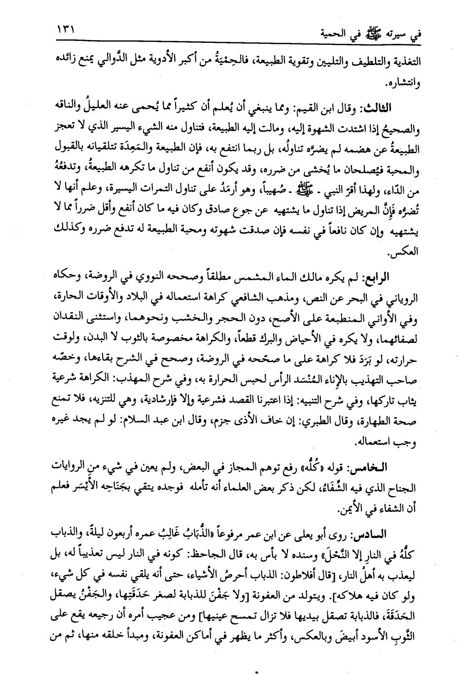 الثالث: وقال ابن القيم: ومما ينبغي أن يعلم أن كثيرا مما يحمى عنه العليل والناقة والصحيح إذا اشتدت الشهوة إليه، ومالت إليه الطبيعة، فتناول منه الشيء اليسير الذي لا تعجز الطبيعة عن هضمه لم يضرّه تناوله، بل ربما انتفع به، فإن الطبيعة والمعدة تتلقيانه بالقبول والمحبة فيصلحان ما يخشى من ضرره، وقد يكون أنفع من تناول ما تكرهه الطبيعة، وتدفعه من الدّاء، ولهذا أقرّ النبي- صلى الله عليه وسلم- صهيبا، وهو أرمد على تناول التمرات اليسيرة، وعلم أنها لا تضرّه فإنّ المريض إذا تناول ما يشتهيه عن جوع صادق وكان فيه ما كان أنفع وأقل ضررا مما لا يشتهيه وإن كان نافعا في نفسه فإن صدقت شهوته ومحبة الطبيعة له تدفع ضرره وكذلك العكس.