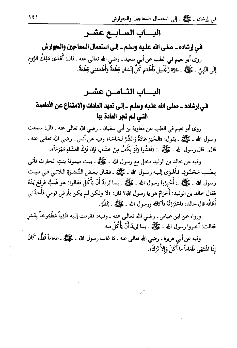 الباب الثامن عشر في إرشاده- صلى الله عليه وسلم- إلى تعهد العادات والامتناع عن الأطعمة التي لم تجر العادة بها