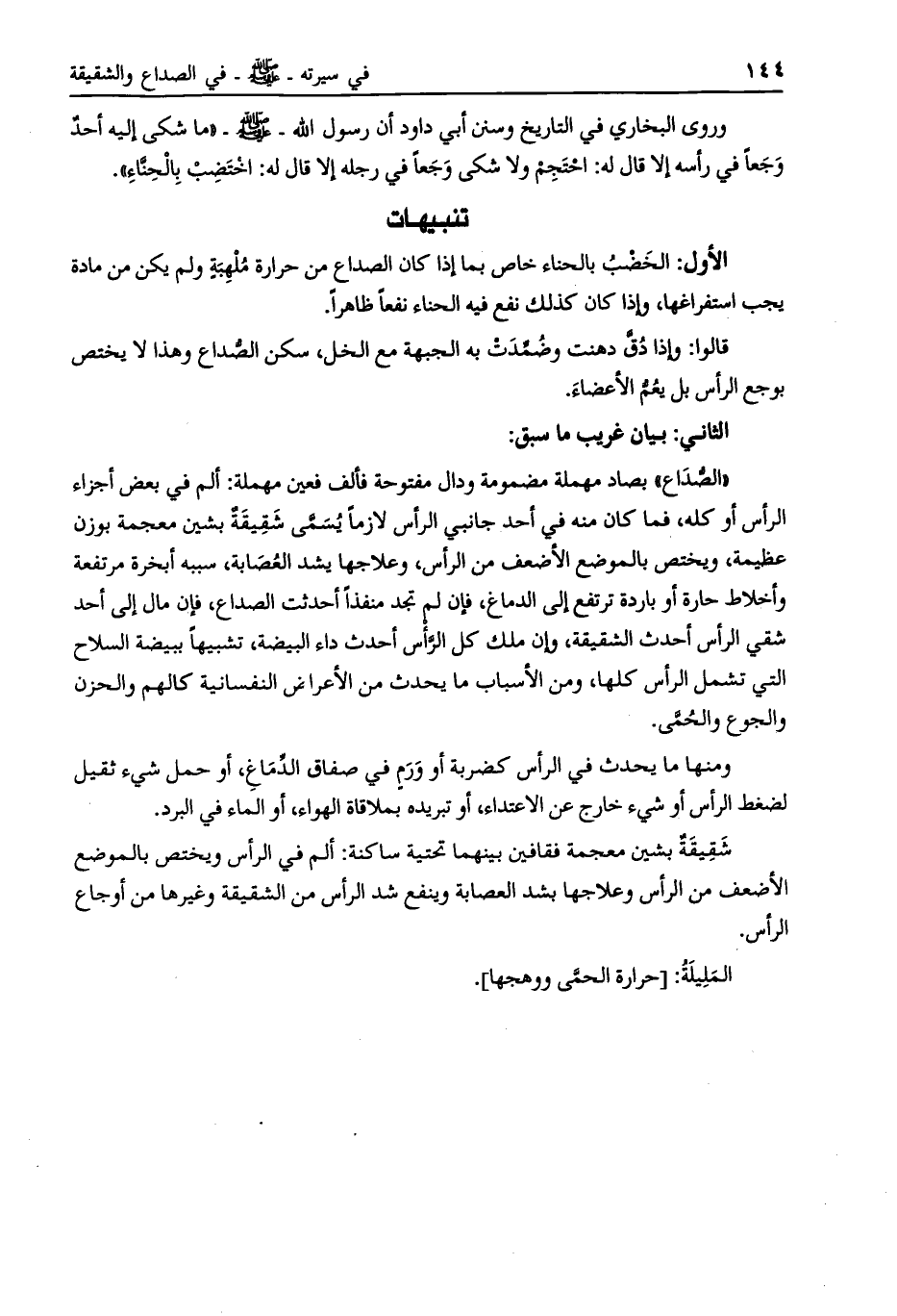 «الصّداع» بصاد مهملة مضمومة ودال مفتوحة فألف فعين مهملة: ألم في بعض أجزاء الرأس أو كله، فما كان منه في أحد جانبي الرأس لازما يسمّى شقيقة بشين معجمة بوزن عظيمة، ويختص بالموضع الأضعف من الرأس، وعلاجها يشد العصابة، سببه أبخرة مرتفعة وأخلاط حارة أو باردة ترتفع إلى الدماغ، فإن لم تجد منفذا أحدثت الصداع، فإن مال إلى أحد شقي الرأس أحدث الشقيقة، وإن ملك كل الرّأس أحدث داء البيضة، تشبيها ببيضة السلاح التي تشمل الرأس كلها، ومن الأسباب ما يحدث من الأعراض النفسانية كالهم والحزن والجوع والحمّى.