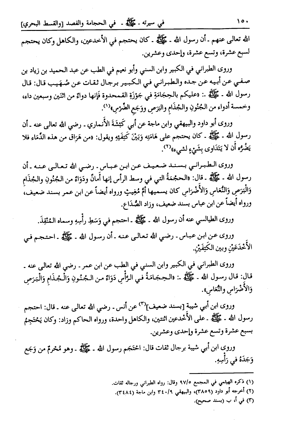 وروى الطبراني بسند ضعيف عن ابن عباس- رضي الله تعالى عنه- أن رسول الله- صلى الله عليه وسلم- قال: «الحجمة التي في وسط الرأس إنها أمان ودواء من الجنون والجذام والبرص والنّعاس والأضراس كان يسميها أمّ مغيث ورواه أيضاً عن ابن عمر بسند ضعيف، ورواه أيضاً عن ابن عباس بسند ضعيف، وزاد الصّداع.