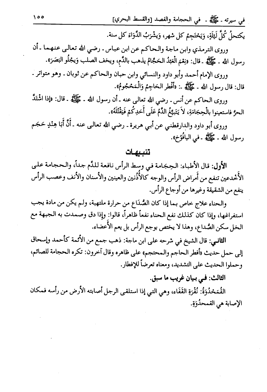 وروى الترمذي وابن ماجه والحاكم عن ابن عباس- رضي الله تعالى عنهما- أن رسول الله- صلى الله عليه وسلم- قال: «نعم العبد الحجّام يذهب بالدّم، ويخف الصلب ويجلو البصر» .