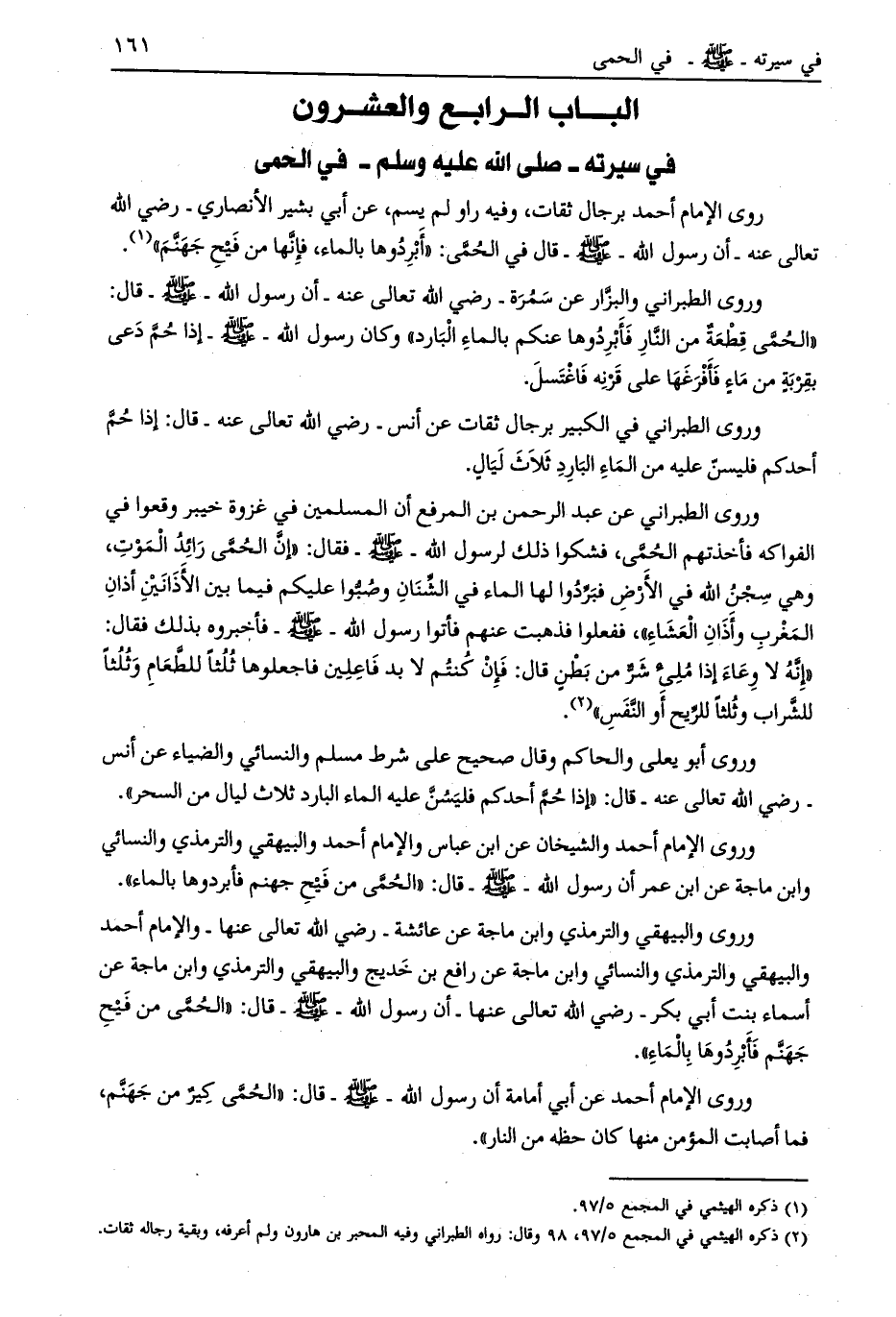 وروى الطبراني والبزّار عن سمرة- رضي الله تعالى عنه- أن رسول الله- صلى الله عليه وسلم- قال: «الحمّى قطعة من النار فأبردوها عنكم بالماء البارد» وكان رسول الله- صلى الله عليه وسلم- إذا حمّ دعى بقربة من ماء فأفرغها على قرنه فاغتسل.