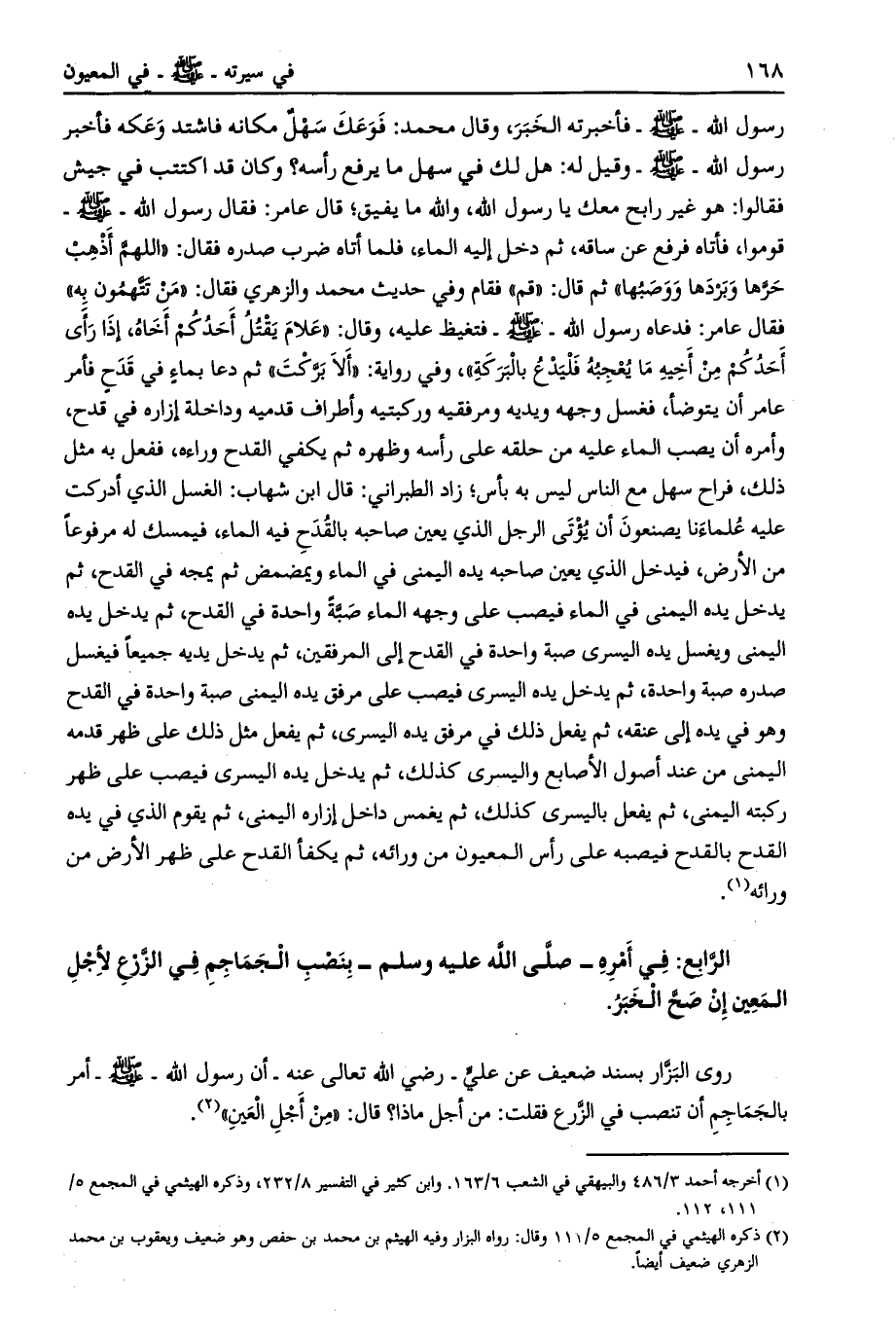 قال عامر: فقال رسول الله- صلى الله عليه وسلم- قوموا، فأتاه فرفع عن ساقه، ثم دخل إليه الماء، فلما أتاه ضرب صدره فقال: «اللهم أذهب حرّها وبردها ووصبها» ثم قال: «قم» فقام وفي حديث محمد والزهري فقال: «من تتّهمون به» فقال عامر: فدعاه رسول الله- صلى الله عليه وسلم- فتغيظ عليه، وقال: «علام يقتل أحدكم أخاه، إذا رأى أحدكم من أخيه ما يعجبه فليدع بالبركة» ، وفي رواية: «ألا برّكت» ثم دعا بماء في قدح فأمر عامر أن يتوضأ، فغسل وجهه ويديه ومرفقيه وركبتيه وأطراف قدميه وداخلة إزاره في قدح، وأمره أن يصب الماء عليه من حلقه على رأسه وظهره ثم يكفي القدح وراءه، ففعل به مثل ذلك، فراح سهل مع الناس ليس به بأس،