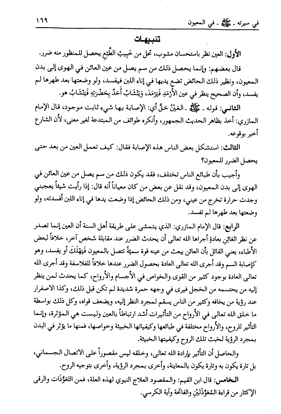 الرابع: قال الإمام المازري: الذي يتمشى على طريقة أهل السنة أن العين إنما تصدر عن نظر العائن بعادة أجراها الله تعالى أن يحدث الضرر عند مقابلة شخص آخر، خلافا لبعض الأطباء، يعني القائل بأن العائن يبعث من عينه قوة سميّة تتصل بالمعيون فيهلك أو يفسد، وهو كإصابة السم وقد أجرى الله تعالى العادة بحصول الضرر عندها خلافا للفلاسفة وقد أجرى الله تعالى العادة بوجود كثير من القوى والخواص في الأجسام والأرواح، كما يحدث لمن ينظر إليه من يحتسمه من الخجل فيرى في وجهه حمرة شديدة لم تكن قبل ذلك، وكذا الاصفرار عند رؤية من يخافه وكثير من الناس يسقم لمجرد النظر إليه، ويضعف قواه، وكل ذلك بواسطة ما خلق الله تعالى في الأرواح من التأثيرات أشد ارتباطا بالعين وليست هي المؤثرة، وإنما التأثير للروح، والأرواح مختلفة في طبائعها وكيفياتها الخبيثة وخواصها، فمنها ما يؤثر في البدن بمجرد الرؤية لخبث تلك الروح وكيفيتها الخبيثة.