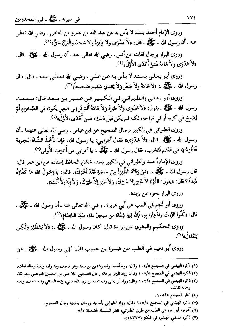 وروى أبو يعلى بسند لا بأس به عن علي- رضي الله تعالى عنه- قال: قال رسول الله- صلى الله عليه وسلم-: «لا هامة ولا صفر ولا يعدي سقيم صحيحا»