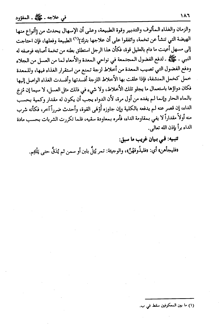 والزمان والغذاء المألوف والتدبير وقوة الطبيعة، وعلى أن الإسهال يحدث من [أنواع منها الهيضة التي تنشأ عن تخمة، واتفقوا على أن علاجها بترك] [ (1) ] الطبيعة وفعلها، فإن احتاجت إلى مسهل أعينت ما دام بالعليل قوة، فكأن هذا الرجل استطلق بطنه من تخمة أصابته فوصفه له النبي- صلى الله عليه وسلم- لدفع الفضول المجتمعة في نواحي المعدة والأمعاء لما من العسل من الجلاء ودفع الفضول التي تصيب المعدة من أخلاط لزجة تمنع من استقرار الغذاء فيها، وللمعدة خمل كخمل المنشفة، فإذا علقت بها الأخلاط اللزجة أفسدتها وأفسدت الغذاء الواصل إليها فكان دواؤها باستعمال ما يجلو تلك الأخلاط، ولا شيء في ذلك مثل العسل، لا سيما إن مزج بالماء الحار وإنما لم يفده من أول مرة، لأن الدواء يجب أن يكون له مقدار وكمية بحسب الداء، إن قصر عنه لم يدفعه بالكلية وإن جاوزه أوهى القوة، وأحدث ضررا آخر، فكأنه شرب منه أولا مقدارا لا يفي بمقاومة الداء، فأمره بمعاودة سقيه، فلما تكررت الشربات بحسب مادة الداء برأ بإذن الله تعالى.