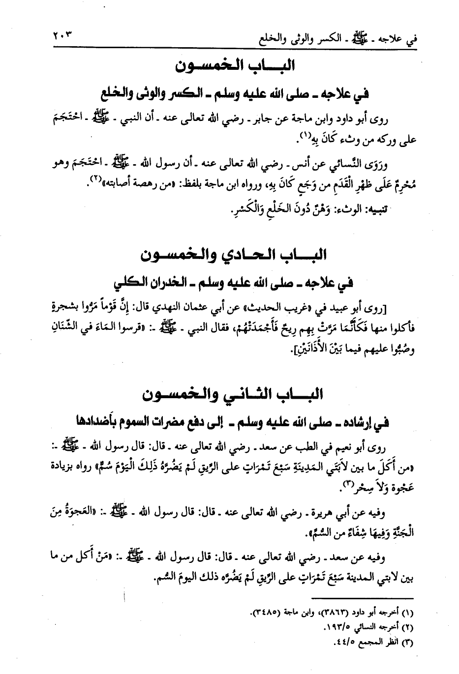 الباب الخمسون في علاجه- صلّى الله عليه وسلم- الكسر والوثى والخلع