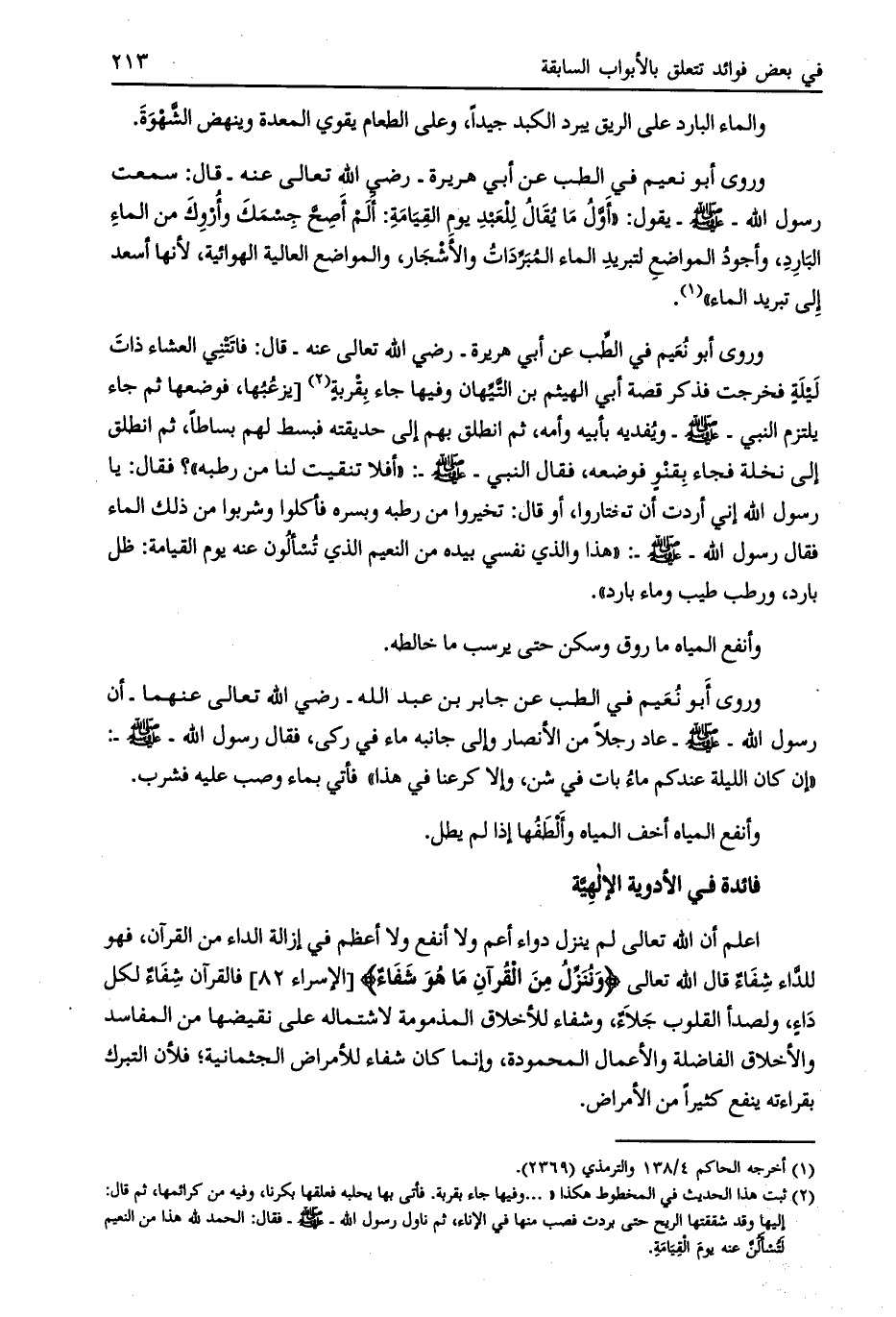 وروى أبو نعيم في الطب عن أبي هريرة- رضي الله تعالى عنه- قال: سمعت رسول الله- صلى الله عليه وسلم- يقول: «أوّل ما يقال للعبد يوم القيامة: ألم أصحّ جسمك وأروك من الماء البارد، وأجود المواضع لتبريد الماء المبرّدات والأشجار، والمواضع العالية الهوائية، لأنها أسعد إلى تبريد الماء»