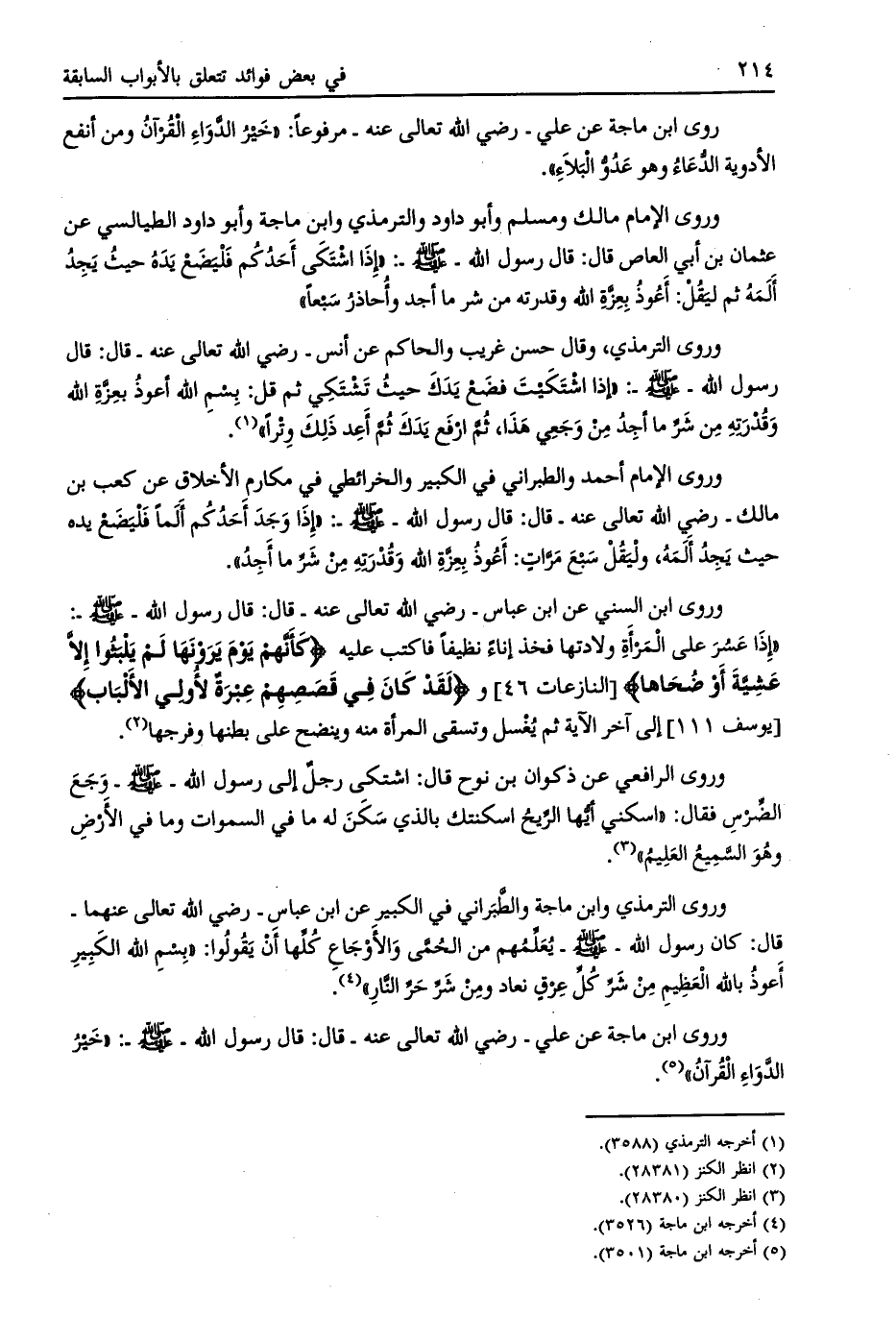 وروى الإمام مالك ومسلم وأبو داود والترمذي وابن ماجة وأبو داود الطيالسي عن عثمان بن أبي العاص قال: قال رسول الله- صلى الله عليه وسلم-: «إذا اشتكى أحدكم فليضع يده حيث يجد ألمه ثم ليقل: أعوذ بعزّة الله وقدرته من شر ما أجد وأحاذر سبعا»