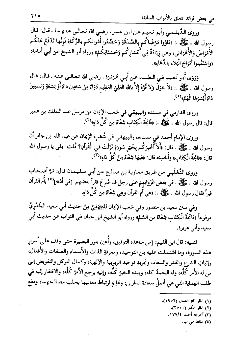 وروى الدارمي في مسنده والبيهقي في شعب الإيمان من مرسل عبد الملك بن عمير قال: قال رسول الله- صلى الله عليه وسلم-: «فاتحة الكتاب شفاء من كل داء»