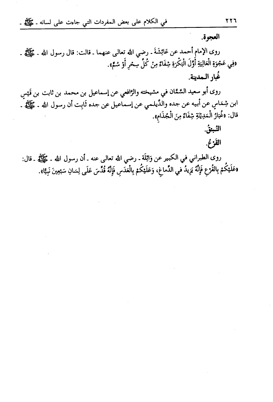 روى الإمام أحمد عن عائشة- رضي الله تعالى عنهما- قالت: قال رسول الله- صلى الله عليه وسلم- «في عجوة العالية أوّل البكرة شفاء من كل سحر أو سمّ» .