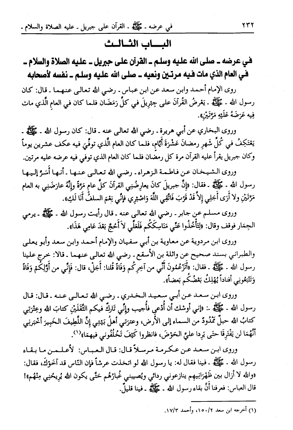 الباب الثالث في عرضه- صلّى الله عليه وسلّم- القرآن على جبريل- عليه الصلاة والسلام- في العام الذي مات فيه مرتين ونعيه- صلى الله عليه وسلم- نفسه لأصحابه