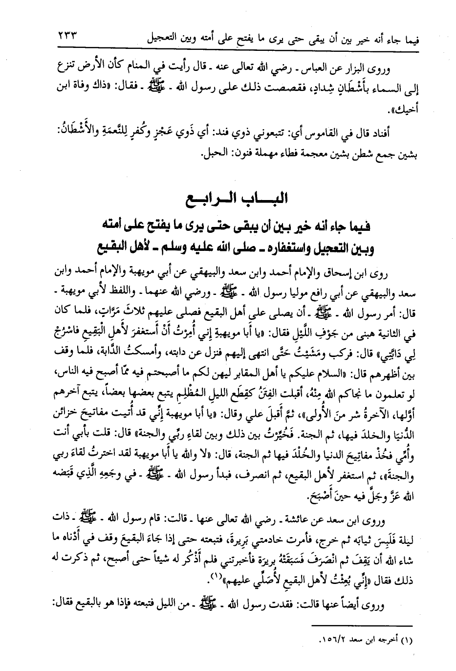 الباب الرابع فيما جاء أنه خيّر بين أن يبقى حتى يرى ما يفتح على أمته وبين التعجيل واستغفاره- صلى الله عليه وسلّم- لأهل البقيع