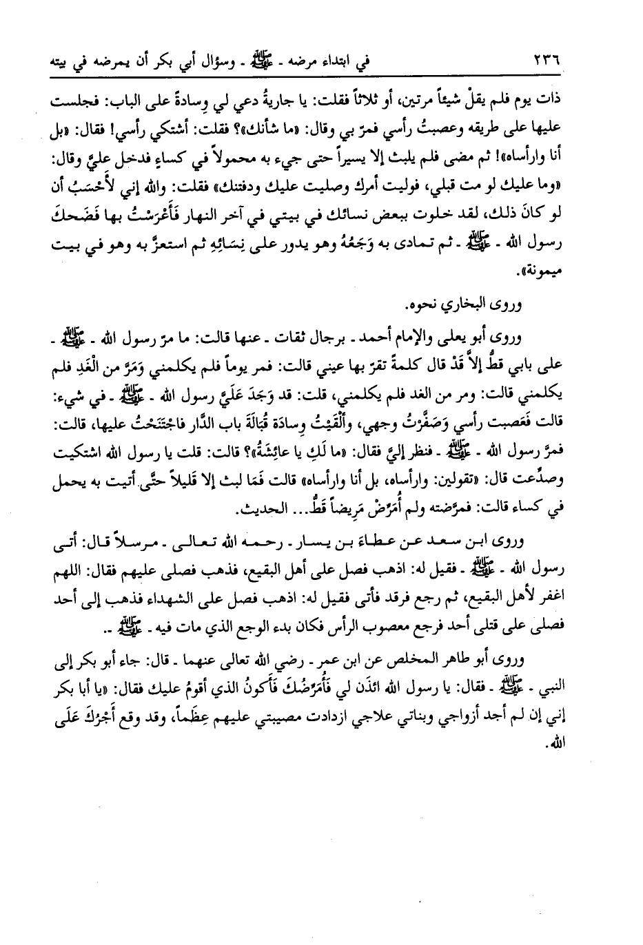 وروى أبو طاهر المخلص عن ابن عمر- رضي الله تعالى عنهما- قال: جاء أبو بكر إلى النبي- صلى الله عليه وسلم- فقال: يا رسول الله ائذن لي فأمرّضك فأكون الذي أقوم عليك فقال: «يا أبا بكر إني إن لم أجد أزواجي وبناتي علاجي ازدادت مصيبتي عليهم عظما، وقد وقع أجرك على الله.
