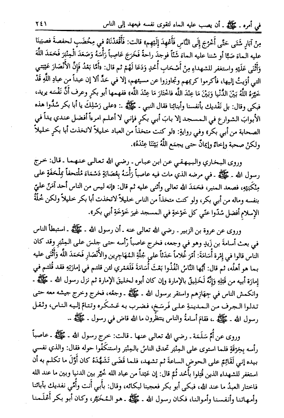 وروى البخاريّ والبيهقي عن ابن عباس- رضي الله تعالى عنهما- قال: خرج رسول الله- صلى الله عليه وسلم- في مرضه الذي مات فيه عاصبا رأسه بعصابة دسماء ملتحفا بملحفة على منكبيه، فصعد المنبر، فحمد الله تعالى وأثنى عليه ثم قال: «أنه ليس من الناس أحد آمنّ عليّ بنفسه وماله من أبي بكر، ولو كنت متخذا من الناس خليلاً لاتخذت أبا بكر خليلا ولكن خلّة الإسلام أفضل سدّوا عنّي كل خوخة في المسجد غير خوخة أبي بكر» .