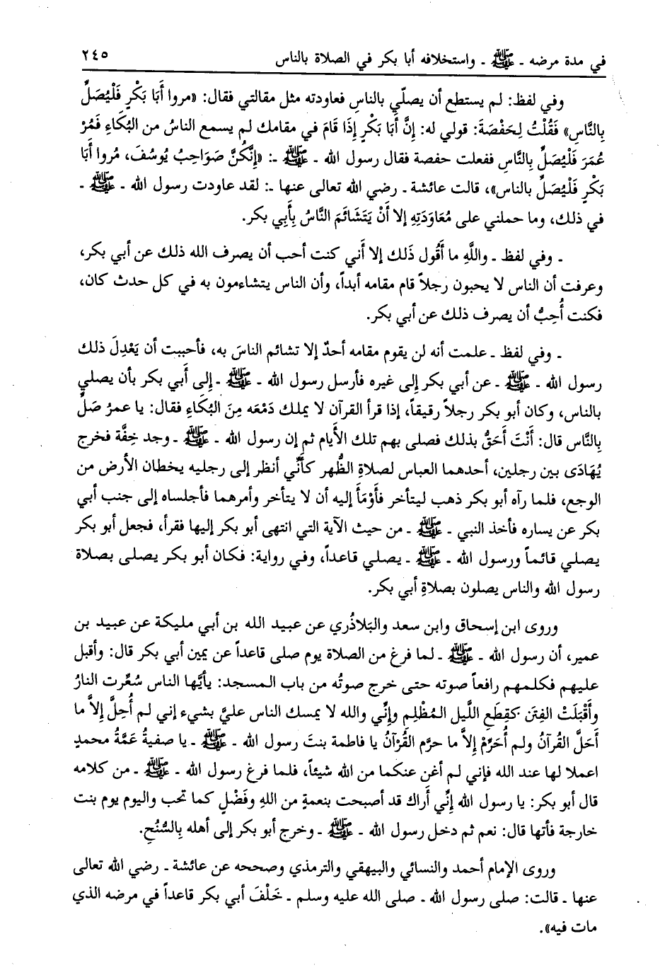 وفي لفظ: لم يستطع أن يصلّي بالناس فعاودته مثل مقالتي فقال: «مروا أبا بكر فليصلّ بالنّاس» فقلت لحفصة: قولي له: أن أبا بكر إذا قام في مقامك لم يسمع الناس من البكاء فمر عمر فليصلّ بالناس ففعلت حفصة فقال رسول الله- صلى الله عليه وسلم-: «إنّكنّ صواحب يوسف، مروا أبا بكر فليصلّ بالناس» ، قالت عائشة- رضي الله تعالى عنها-: لقد عاودت رسول الله- صلى الله عليه وسلم- في ذلك، وما حملني على معاودته إلا أن يتشائم النّاس بأبي بكر.