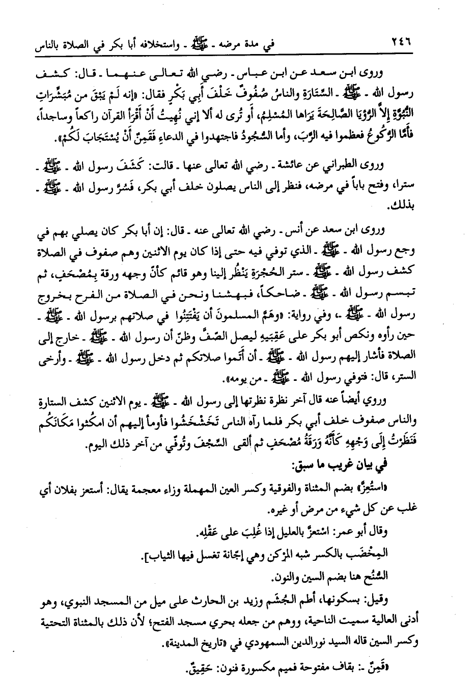 وروى الطبراني عن عائشة- رضي الله تعالى عنها- قالت: كشف رسول الله- صلى الله عليه وسلم- سترا، وفتح بابا في مرضه، فنظر إلى الناس يصلون خلف أبي بكر، فسرّ رسول الله- صلى الله عليه وسلم- بذلك.
