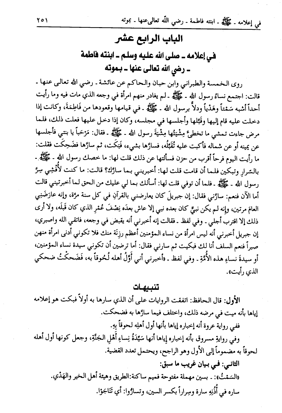 الباب الرابع عشر في إعلامه- صلى الله عليه وسلم- ابنته فاطمة- رضي الله تعالى عنها- بموته