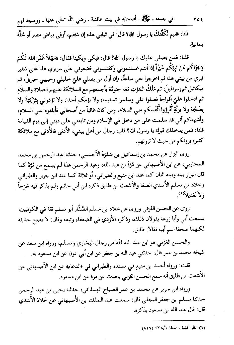 قلنا: فمن يصلي عليك يا رسول الله؟ قال: فبكى وبكينا فقال: «مهلا غفر الله لكم وجزاكم عن نبيّكم خيرا إذا أنتم غسلتموني وكفنتموني فضعوني على سريري هذا على شفير قبري من بيتي هذا ثم اخرجوا عني ساعة، فإن أول من يصلي عليّ خليلي وحبيبي جبريل، ثم ميكائيل ثم إسرافيل، ثم ملك الموت معه جنوده بأجمعهم مع الملائكة عليهم الصلاة والسلام ثم ادخلوا عليّ أفواجا فصلوا علي وسلموا تسليما، ولا يؤمكم أحدا، ولا تؤذوني بتزكية ولا بضجّة ولا برنّة أقرؤوا أنفسكم مني السلام، ومن كان غائبا من أصحابي فأبلغوه عني السلام، وأشهدكم أني قد سلمت على من دخل في الإسلام ومن تابعني على ديني إلى يوم القيامة قلنا: فمن يدخلك قبرك يا رسول الله؟ قال: رجال من أهل بيتي، الأدنى فالأدنى مع ملائكة كثير، يرونكم من حيث لا ترونهم.