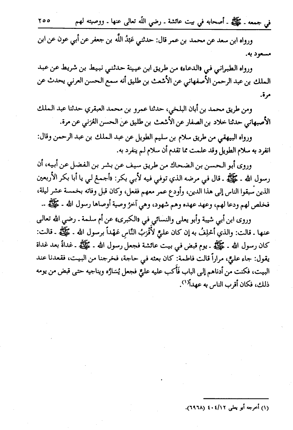 وروى ابن أبي شيبة وأبو يعلى والنسائي في «الكبرى» عن أم سلمة- رضي الله تعالى عنها- قالت: والذي أحلف به إن كان عليّ لأقرب النّاس عهدا برسول الله- صلى الله عليه وسلم- قالت: