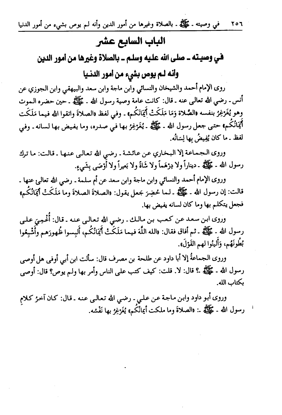 روى الإمام أحمد والشيخان والنسائي وابن ماجة وابن سعد والبيهقي وابن الجوزي عن أنس- رضي الله تعالى عنه- قال: كانت عامة وصية رسول الله- صلى الله عليه وسلم- حين حضره الموت وهو يغرغر بنفسه «الصّلاة وما ملكت أيمانكم» - وفي لفظ «الصلاة واتقوا الله فيما ملكت أيمانكم» حتى جعل رسول الله- صلى الله عليه وسلم- يغرغر بها في صدره، وما يفيض بها لسانه- وفي لفظ- ما كان يفيض بها لسانه.