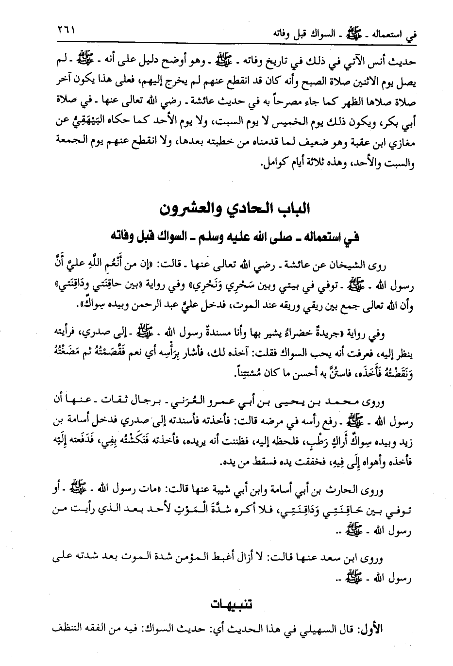 الباب الحادي والعشرون في استعماله- صلّى الله عليه وسلم- السواك قبل وفاته