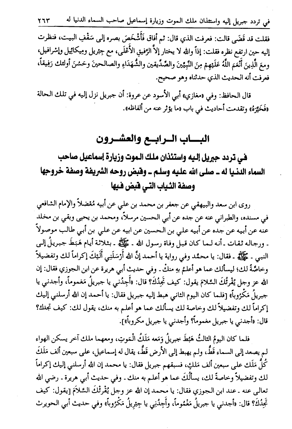 الباب الرابع والعشرون في تردد جبريل إليه واستئذان ملك الموت وزيارة إسماعيل صاحب السماء الدنيا له- صلّى الله عليه وسلم- وقبض روحه الشريفة وصفة خروجها وصفة الثياب التي قبض فيها