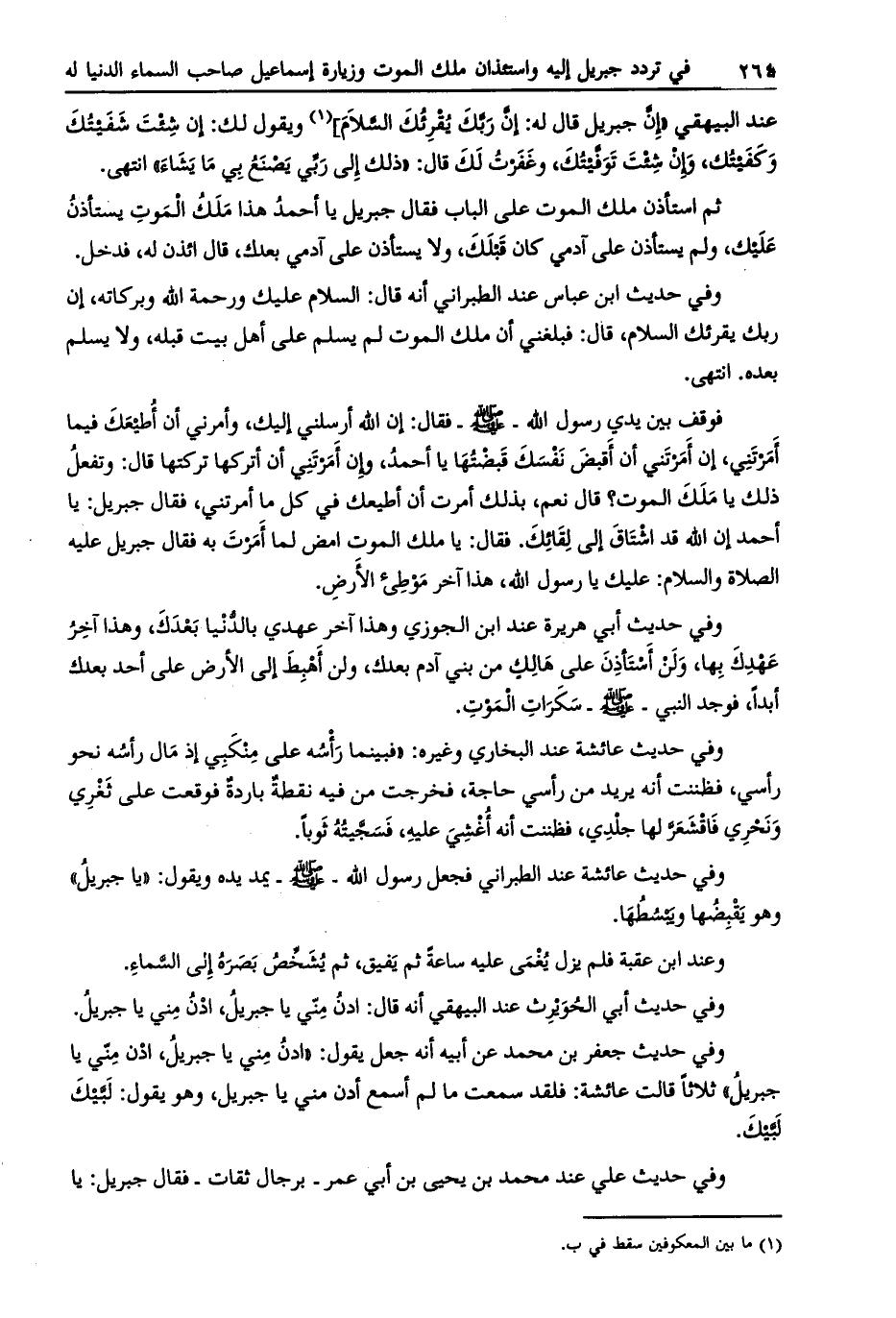 وفي حديث جعفر بن محمد عن أبيه إنه جعل يقول: «ادن مني يا جبريل، ادن منّي يا جبريل» ثلاثا قالت عائشة: فلقد سمعت ما لم أسمع أدن مني يا جبريل، وهو يقول: لبّيك لبّيك.