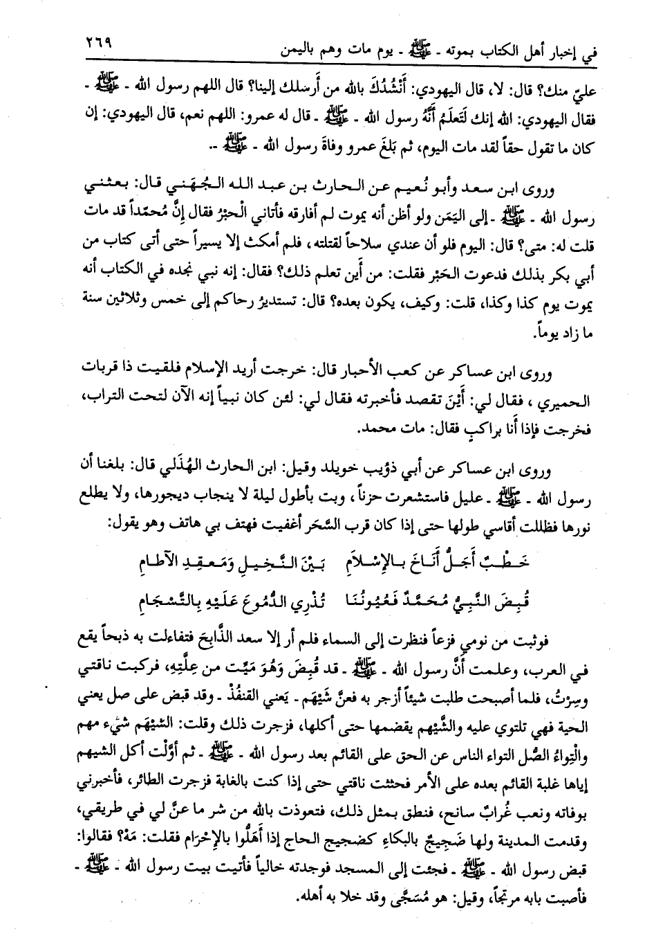 عليّ منك؟ قال: لا، قال اليهودي: أنشدك بالله من أرسلك إلينا؟ قال اللهم رسول الله- صلى الله عليه وسلم- فقال اليهودي: الله إنك لتعلم أنه رسول الله- صلى الله عليه وسلم- قال له عمرو: اللهم نعم، قال اليهودي: إن كان ما تقول حقا لقد مات اليوم، ثم بلغ عمرو وفاة رسول الله- صلى الله عليه وسلم-.