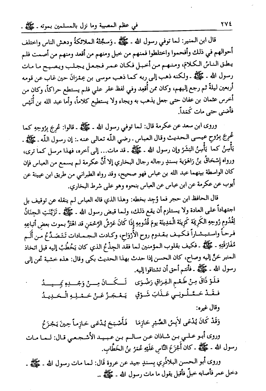 وروى أبو الحسن البلاذري بسند جيد عن عروة قال: لما مات رسول الله- صلى الله عليه وسلم- دخل عمر فأصابه خبل فأقبل يقول ما مات رسول الله- صلى الله عليه وسلم-.