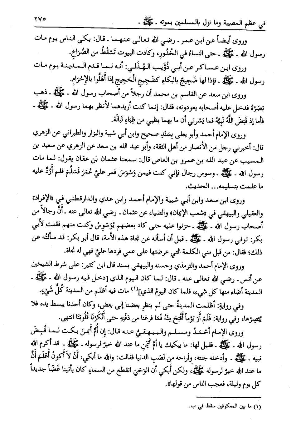 وروى أيضا عن ابن عمر- رضي الله تعالى عنهما- قال: بكى الناس يوم مات رسول الله- صلى الله عليه وسلم- حتى النساء في الخدور، وكادت البيوت تسقط من الصّراخ.