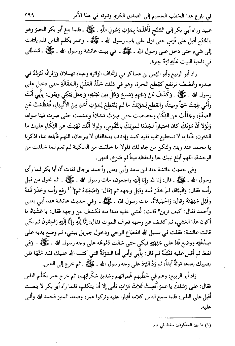زاد أبو الربيع وأبو اليمن بن عساكر في «إتحاف الزائر» وعيناه تهملان وزفراته تتردّد في صدره وعصصه ترتفع كقطع الحرة، وهو في ذلك جلد العقل والمقالة حتى دخل على رسول الله- صلى الله عليه وسلم- وكشف عن وجهه ومسح وقبل بين عينيه، وجعل يبكي ويقول: بأبي أنت وأمي طبت حيّا وميتا، وانقطع لموتك ما لم ينقطع لموت أحد من الأنبياء، فعظمت عن الصفة، وجللت عن البكاء وحصصت حتى صرت مسلاة وعممت حتى صرت فينا سواء، ولولا أنّ موتك كان اختبارا لجدنا لموتك بالنّفوس، ولولا أنّك نهيت عن البكاء عليك ما الشئون، فأما ما لا نستطيع تقيه ففيه كمد وإدناف يتخالفان لا يبرحان، اللهم فأبلغه عنا، اذكرنا يا محمد عند ربك ولتكن من جاء لك فلولا ما خلقت من السكينة لم تعم لما خلقت من الوحشة، اللهم أبلغ نبيك عنا واحفظه ميتا ثم صرخ. انتهى.