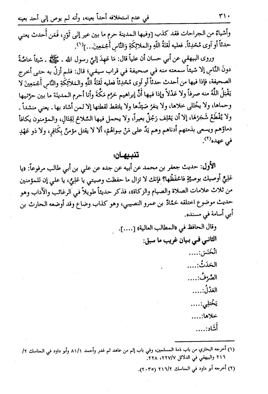 [ (1) ] أخرجه البخاري من باب ذمة المسلمين، وفي باب إثم من عاهد ثم غدر وأحمد 1/ 81 وأبو داود في المناسك 2/ 216 والبيهقي في الدلائل 7/ 227، 228.