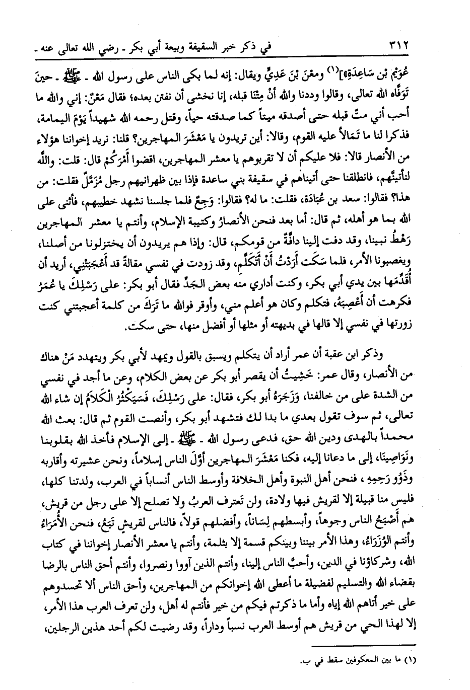 [ (1) ] ومعن بن عديّ ويقال: إنه لما بكى الناس على رسول الله- صلى الله عليه وسلم- حين توفّاه الله تعالى، وقالوا وددنا والله أن متنا قبله، إنا نخشى أن نفتن بعده، فقال معن: إني والله ما أحب أني متّ قبله حتى أصدقه ميتا كما صدقته حيا، وقتل رحمه الله شهيدا يوم اليمامة، فذكرا لنا ما تمالأ عليه القوم، وقالا: أين تريدون يا معشر المهاجرين؟ قلنا: نريد إخواننا هؤلاء من الأنصار قالا: فلا عليكم أن لا تقربوهم يا معشر المهاجرين، اقضوا أمركم قال: قلت: والله لنأتينّهم، فانطلقنا حتى أتيناهم في سقيفة بني ساعدة فإذا بين ظهرانيهم رجل مزمّل فقلت: من هذا؟ فقالوا: سعد بن عبادة، فقلت: ما له؟ فقالوا: وجع فلما جلسنا نشهد خطيبهم، فأثنى على الله بما هو أهله، ثم قال: أما بعد فنحن الأنصار وكتيبة الإسلام، وأنتم يا معشر المهاجرين رهط نبينا، وقد دفت إلينا دافّة من قومكم، قال: وإذا هم يريدون أن يختزلونا من أصلنا، ويغصبونا الأمر، فلما سكت أردت أن أتكلّم، وقد زودت في نفسي مقالة قد أعجبتني، أريد أن أقدّمها بين يدي أبي بكر، وكنت أداري منه بعض الجدّ فقال أبو بكر: على رسلك يا عمر فكرهت أن أعصبه، فتكلم وكان هو أعلم مني، وأوقر فو الله ما ترك من كلمة أعجبتني كنت زورتها في نفسي إلا قالها في بديهته أو مثلها أو أفضل منها، حتى سكت.