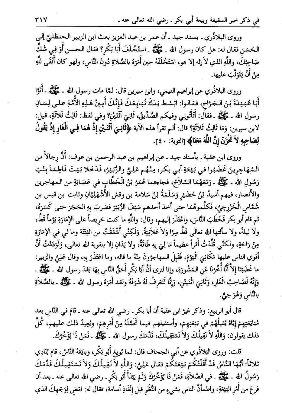 وروى البلاذري- بسند جيد- أن عمر بن عبد العزيز بعث ابن الزبير الحنظليّ إلى الحسن فقال له: هل كان رسول الله- صلى الله عليه وسلم- استخلف أبا بكر؟ فقال الحسن أوفي شكّ صاحبك، والله الذي لا إله إلا هو، استخلفه حين أمره بالصّلاة دون النّاس، ولهو كان أتقى لله من أن يتوثّب عليها.