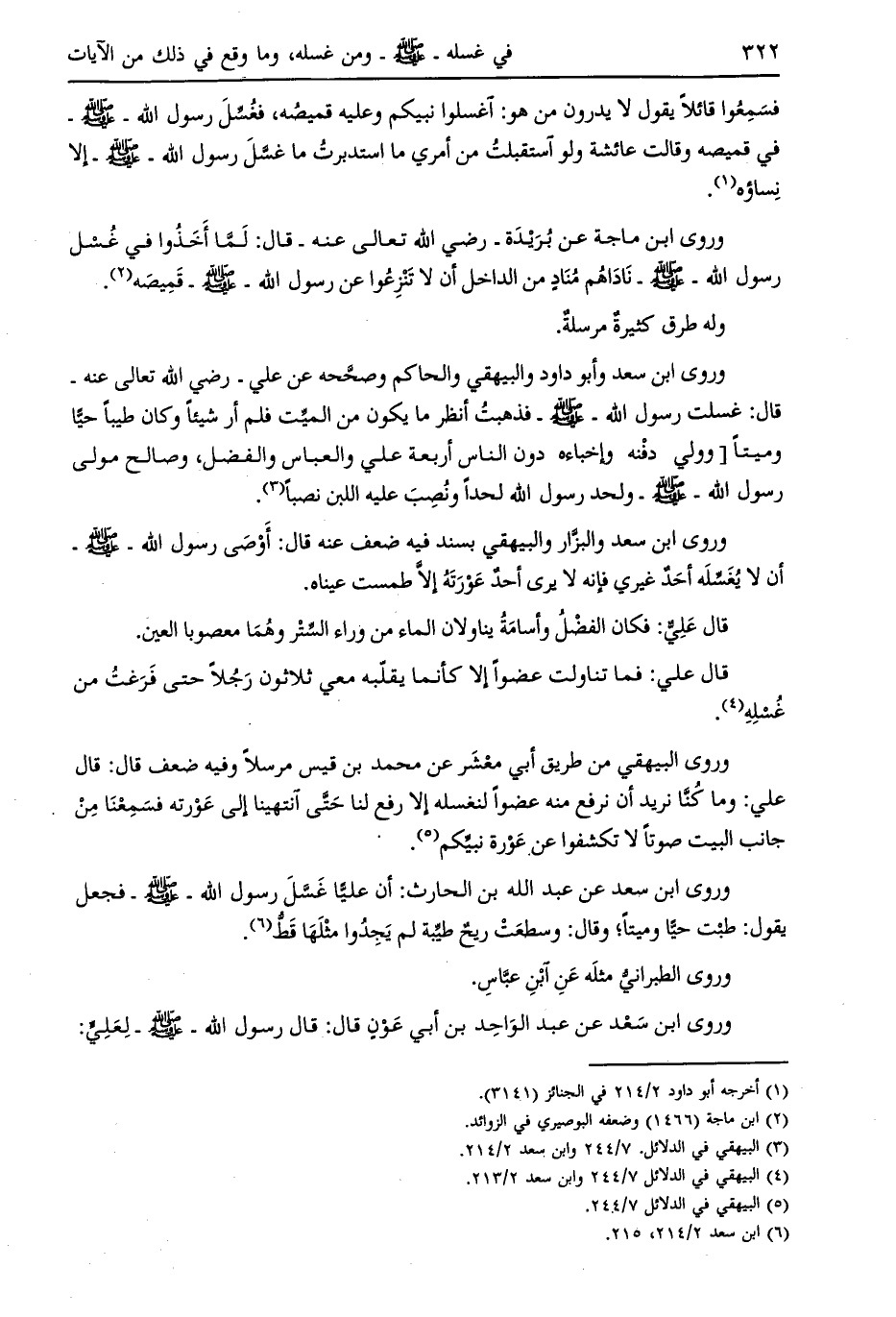 وروى ابن ماجه عن بريدة- رضي الله تعالى عنه- قال: لمّا أخذوا في غسل رسول الله- صلى الله عليه وسلم- ناداهم مناد من الداخل أن لا تنزعوا عن رسول الله- صلى الله عليه وسلم- قميصه [ (2) ] .