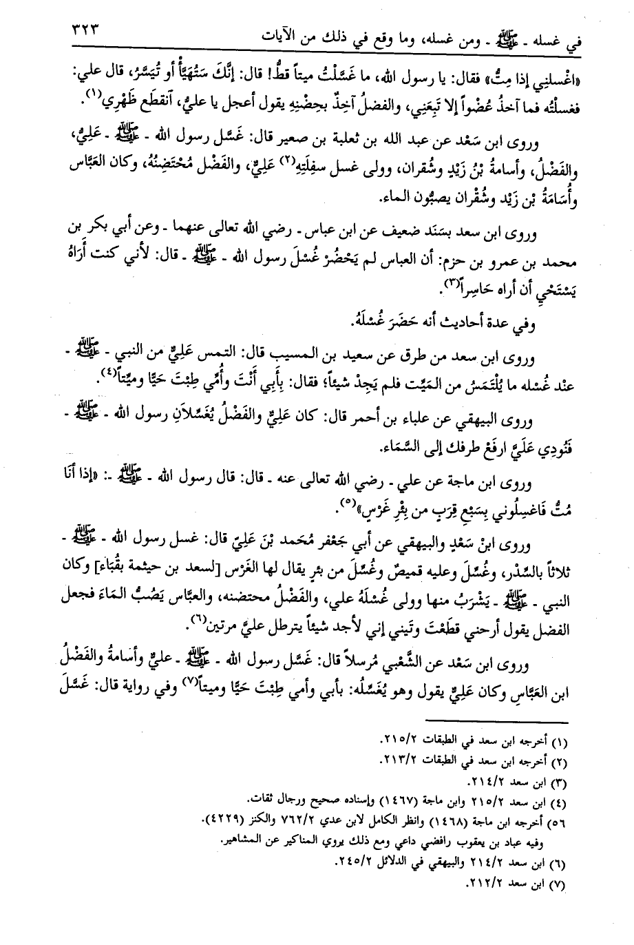 وروى البيهقي عن علباء بن أحمر قال: كان علي والفضل يغسّلان رسول الله- صلى الله عليه وسلم- فنودي عليّ ارفع طرفك إلى السماء.