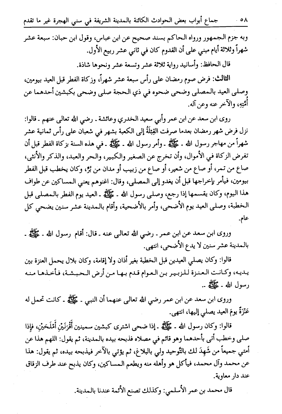 الثالث: فرض صوم رمضان على رأس سبعة عشر شهرا، وزكاة الفطر قبل العيد بيومين، وصلى العيد بالمصلى وضحى ضحوه في ذي الحجة صلى وضحى بكبشين أحدهما عن أمّته، والآخر عنه وعن آله.