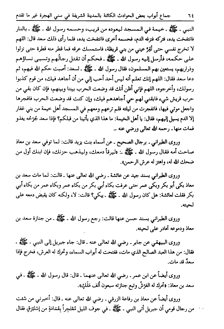 وروى الطبراني بسند حسن عنها قالت: رجع رسول الله- صلى الله عليه وسلم- من جنازة سعد بن معاذ ودموعه تحادر على لحيته.