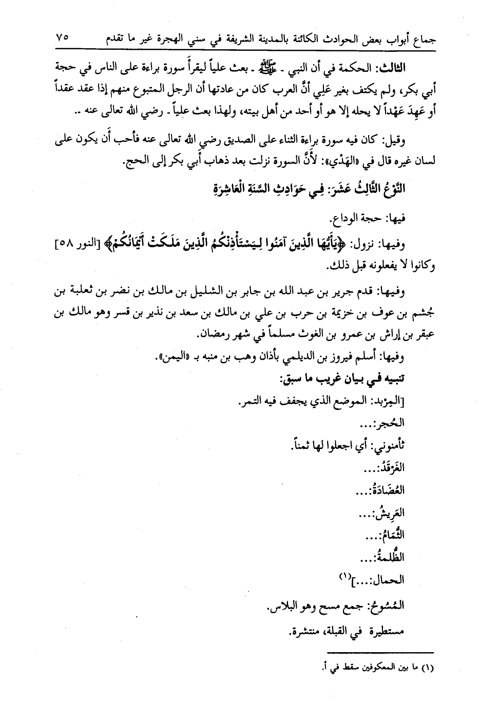 وفيها: نزول: يا أَيُّهَا الَّذِينَ آمَنُوا لِيَسْتَأْذِنْكُمُ الَّذِينَ مَلَكَتْ أَيْمانُكُمْ [النور 58] وكانوا لا يفعلونه قبل ذلك.