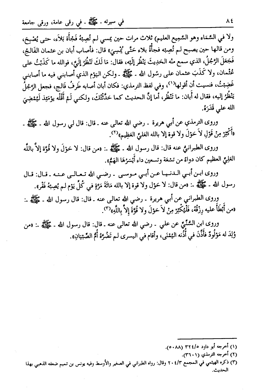 وروى الترمذي عن أبي هريرة- رضي الله تعالى عنه- قال: قال لي رسول الله- صلى الله عليه وسلم- «أكثر من قول لا حول ولا قوة إلا بالله العليّ العظيم»