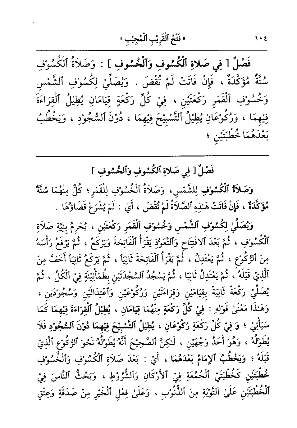 {فصل} (وصلاة الكسوف) للشمس، وصلاة الخسوف للقمر، كل منهما (سنة مؤكدة، فإن فاتت) هذه الصلاة (لم تقض) أي لم يُشرَع قضاؤُها. (ويصلي لكسوف الشمس وخسوف القمر ركعتين) يحرم بنية صلاة الكسوف، ثم بعد الافتتاح والتعوذ يقرأ الفاتحة، ويركع، ثم يرفع رأسه من الركوع، ثم يعتدل، ثم يقرأ الفاتحة ثانيا، ثم يركع ثانيا أخف من الذي قبله، ثم يعتدل ثانيا، ثم يسجد السجدتين بطمأنينة في الكل، ثم يصلي ركعة ثانية بقيامين وقراءتين وركوعين واعتدالين وسجودين. وهذا معنى قوله: (في كل ركعة) منهما (قيامان يطيل القراءة فيهما) كما سيأتي، (و) في كل ركعة (ركوعان يطيل التسبيح فيهما، دون السجود)؛ فلا يطوله، وهو أحد وجهين، لكن الصحيح أنه يطوله نحو الركوع الذي قبله، (ويخطب) الإمام (بعدهما) أي بعد صلاة الكسوف والخسوف (خطبتين) كخطبتي الجمعة في الأركان والشروط، ويحث الناسَ في الخطبتين على التوبة من الذنوب وعلى فعل الخير من صدقة وعتق