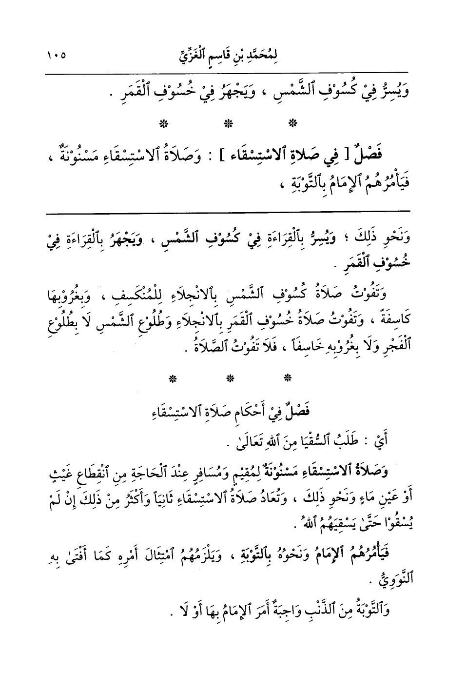 {فصل} في أحكام صلاة الاستسقاء، أي طلب السُقْيَا مِن الله تعالى. (وصلاة الاستسقاء مسنونة) لمقيم ومسافر عند الحاجة من انقطاع غيث أو عين ماء ونحو ذلك. وتُعاد صلاة الاستسقاء ثانيا وأكثر من ذلك إن لم يُسقَوا حتى يسقيهم الله؛ (فيأمرهم الإمامُ) ونحوه (بالتوبة) ويلزمهم امتثال أمره - كما أفتى به النووي. والتوبة من الذنب واجبة. أمر الإمام بها أو لا،