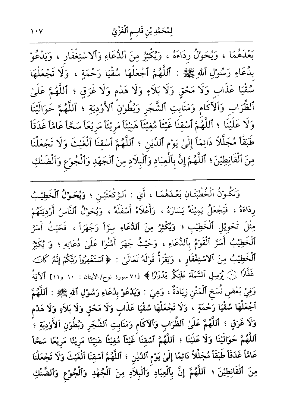 وفي بعض نسخ المتن زيادة وهي: (ويدعو بدعاء رسول الله - صلى الله عليه وسلم -، وهو: «اللهُمَّ اجْعَلْهَا سُقْيَا رَحْمَةٍ، وَلاَ تَجْعَلْهَا سُقْيَا عَذَابٍ، وَلاَ مَحْقٍ، وَلاَ بَلاَءٍ، وَلاَ هَدْمٍ، وَلاَ غَرقٍ؛ اللهُمَّ عَلَى الظِّرَابِ وَالآكَامِ وَمَنَابِتِ الشَّجَرِ، وبُطُونِ الأَوْدِيَةِ؛ اللهُمَّ حَوَالَيْنَا وَلاَ عَلَيْنَا، اللهُمَّ اسْقِنا غَيْثًا مُغيثًا، مَرِيئًا مَرِيعًا، سَحَّا عَامًّا، غَدَقًا طَبَقًا، مُجَلِّلاً دَائِمًا إلَى يَوْمِ الدِّينِ؛ اللهُمَّ اسْقِنَا الغَيْثَ، وَلاَ تَجْعَلْنَا مِنَ الْقَانِطِينَ؛ اللهُمَّ إِنَّ بِالْعِبَادِ وَالبِلاَدِ مِنَ الْجُهْدِ وَالْجُوعِ وَالضَّنْكِ