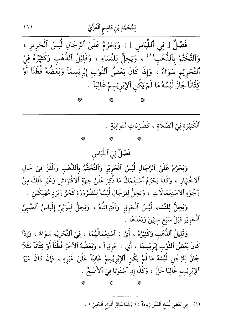 (وقليل الذهب وكثيره) أي استعمالهما (في التحريم سواء. وإذا كان بعض الثوب إبريسما) أي حريرا (وبعضه) الآخر (قُطنا أو كَتَّانًا) مثلا (جاز) للرجل (لبسه مالم يكن الإبريسم غالبا) على غيره؛ فإن كان غير الإبريسم غالبا حل؛ وكذا إن استويا في الأصح.