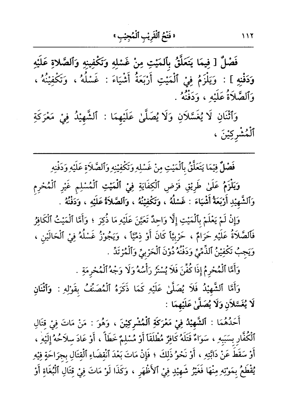 (واثنان لا يغسلان ولا يصلى عليهما): أحدهما (الشهيد في معركة المشركين)، وهو من مات في قتال الكفار بسببه، سواء قتله كافر مطلقا أو مسلم خطأ، أو عاد سلاحه إليه أو سقط عن دابته أو نحو ذلك. فإن مات بعد انقضاء القتال بجراحة فيه يقطع بموته منها فغير شهيد في الأظهر؛ وكذا لو مات في قتال البغاة أو
