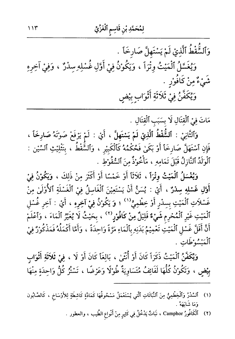 مات في القتال لا بسبب القتال. (و) الثاني (السقط الذي لم يستهل) أي لم يرفع صوته (صارخا). فإن استهل صارخا أو بكى فحكمه كالكبير. والسِّقْط بتثليث السين الولد النازل قبل تمامه، مأخوذ من السقوط.