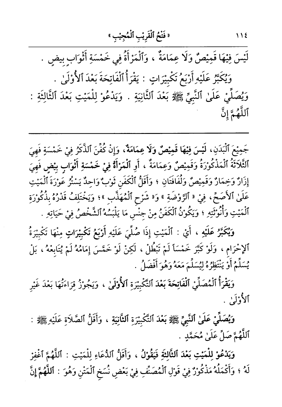 (ويكبر عليه) أي الميت إذا صُلي عليه (أربع تكبيرات)، منها تكبيرة الإحرام؛ ولو كبّر خمسا لم تبطل، لكن لو خمَّس إمامه لم يتابعه بل يسلم أو ينتظره ليسلم معه، وهو أفضل. و (يقرأ) المصلي (الفاتحة بعد) التكبيرة (الأولى)، ويجوز قراءتها بعد غير الأولى؛ (ويصلى على النبي - صلى الله عليه وسلم - بعد) التكبيرة (الثانية). وأقل الصلاة عليه - صلى الله عليه وسلم - اللهُمَّ صَلِّ على مُحَمَّدٍ. (ويدعو للميت بعد الثالثة، فيقول): وأقل الدعاء للميت: «اللهُمَّ اغْفِرْ لَهُ»؛ وأكمله مذكور في قول المصنف في بعض نسخ المتن، وهو: «اللهُمَّ إِنَّ