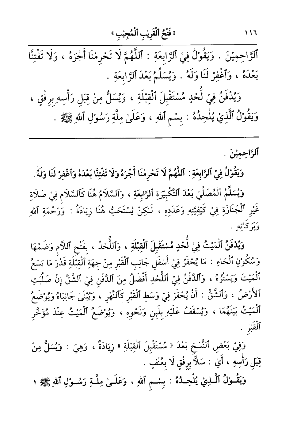 ويقول في الرابعة: «اللهُمَّ لاَ تَحْرِمْنَا أَجْرَهُ، وَلاَ تَفْتِنَّا بَعْدَهُ، وَاغْفِرْ لَنَا وَلَهُ». ويسلم بعد الرابعة.