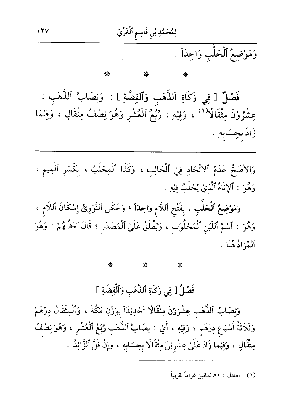 {فصل} (ونصاب الذهب عشرون مثقالا) تحديدا بوزن مكة، والمثقال درهم وثلاثة أسباع درهم، (وفيه) أي نصاب الذهب (ربع العشر، وهو نصف مثقال، وفيما زاد) على عشرين مثقالا (بحسابه) وإن قل الزائد.